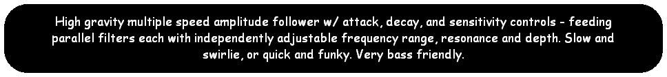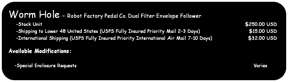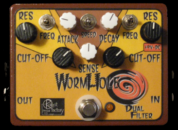 Unsolicited comments and kind words: ".....I got to try out the worm hole for a little while today. I totally dig it. It has an authority to it and works extremely well on bass. There is a lot of low end. This may be the filter that I was searching for. Don't get me wrong, the Meatwad is a great filter, but the Wormhole is 'it.' It just has an attitude that I really like and it sounds HUGE. Still alot of tweaking to do, but every setting sounds great. I really like all the options at my fingers. I will also eventually post info on TalkBass. The guys over there will FLIP over this pedal. I love the amount of lows that pass through......Nice design job." -Nick C. |